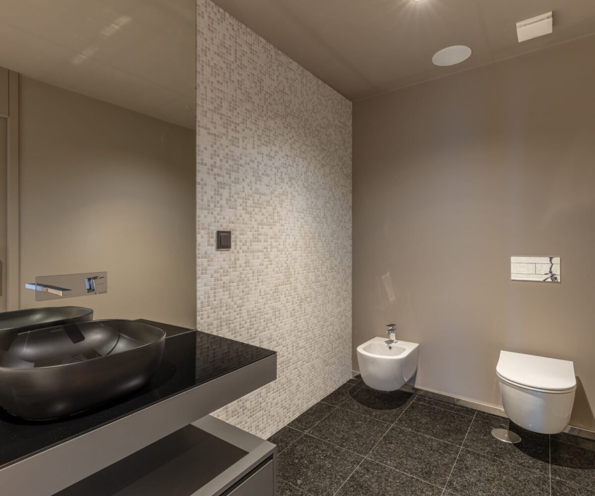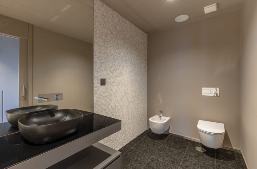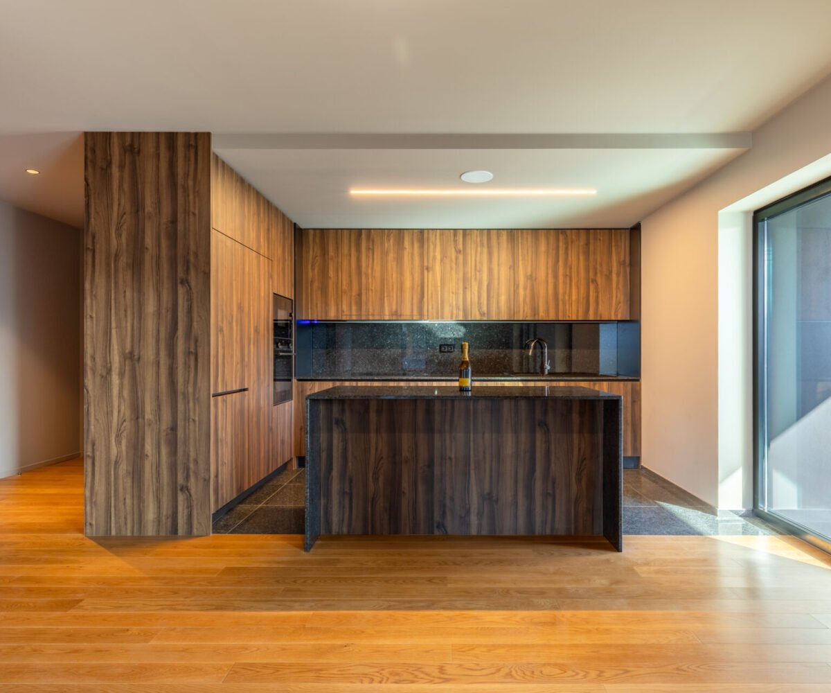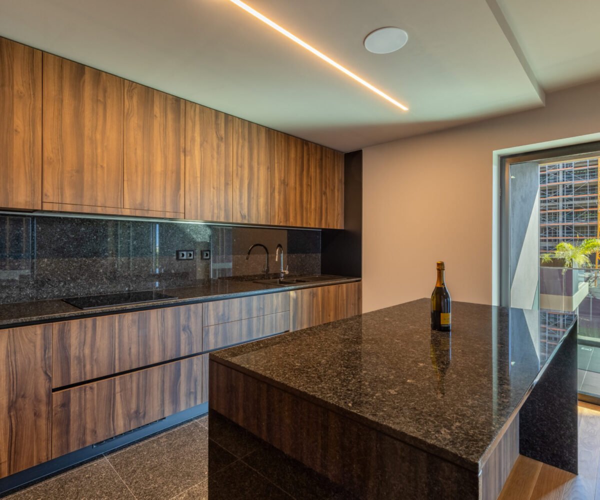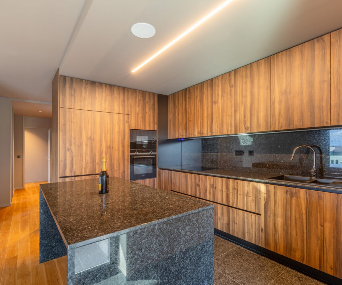 The social area unfolds in a modern open space, where the kitchen integrates harmoniously with the living room. The kitchen combines dark wood with black stone, creating a sophisticated and welcoming environment. It is fully equipped with a hob, oven, microwave, dishwasher, and has ample storage and a central island, perfect for informal meals or culinary support. The unit also has an integrated sound system.