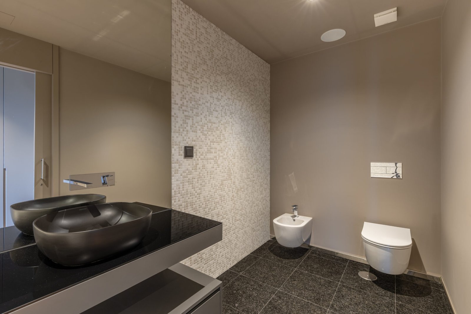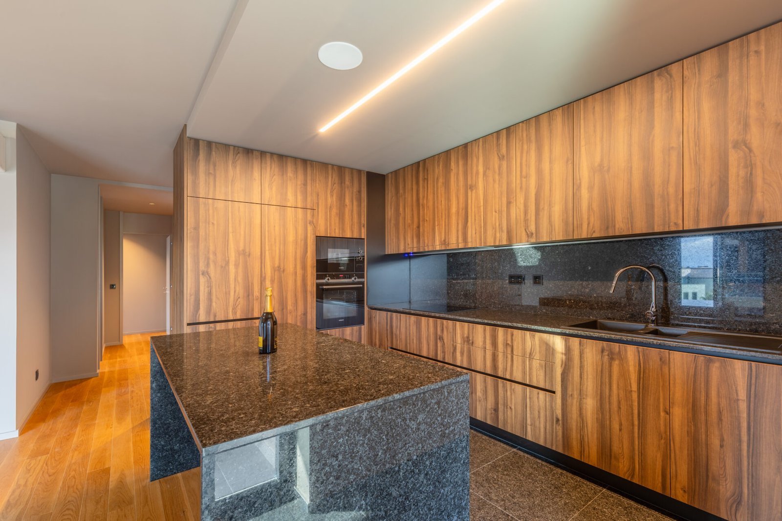 The social area unfolds in a modern open space, where the kitchen integrates harmoniously with the living room. The kitchen combines dark wood with black stone, creating a sophisticated and welcoming environment. It is fully equipped with a hob, oven, microwave, dishwasher, and has ample storage and a central island, perfect for informal meals or culinary support. The unit also has an integrated sound system.
